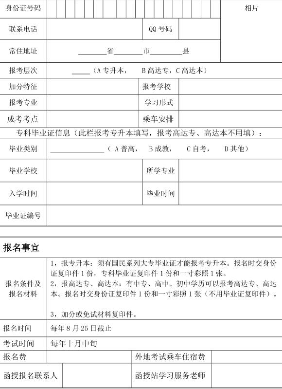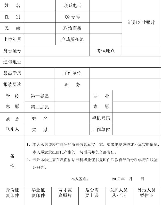 成人高考報(bào)名表每個(gè)地方都不一樣,不過(guò)大體內(nèi)容還是一致,就是要對(duì)你的個(gè)人信息和所報(bào)專業(yè)和院校進(jìn)行有效的登記。