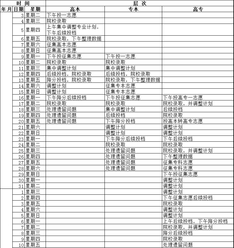 錄取新生工作由省教育考試院統一安排,分批在網上進行。招生學校根據投檔名單和錄取原則提出錄取名單,報省教育考試院審核。招生學校按審核后的錄取名單寄發省教育考試院統一印制的《新生入學通知書》。錄取的新生,憑《新生入學通知書》、《準考證》和《報考信息核對表》到招生學校報到。