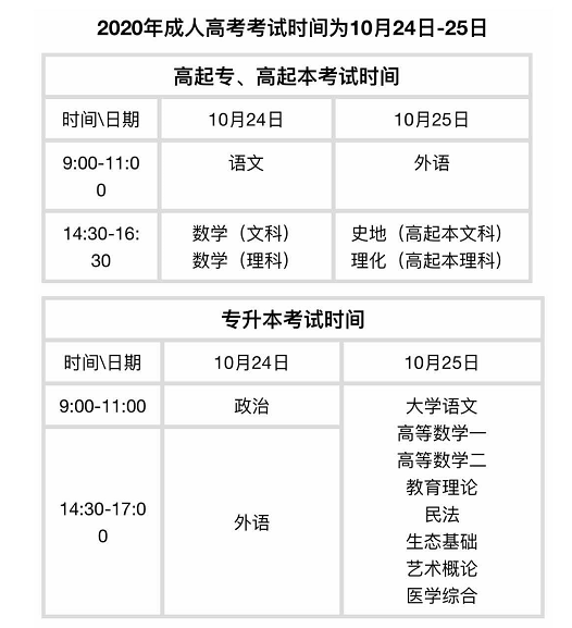 2020年全國成人高校招生統一考試時間為10月24日至25日,山西成人高考屬于全國統考,一年只有一次考試機會,考試依據2011年版《全國各類成人高等學校招生復習考試大綱》命題,每科試題滿分均為150分。2020年山西成人高考高起專、高起本每科考試時間為120分鐘,專升本每科考試時間為150分鐘,具體考試時間安排如下: